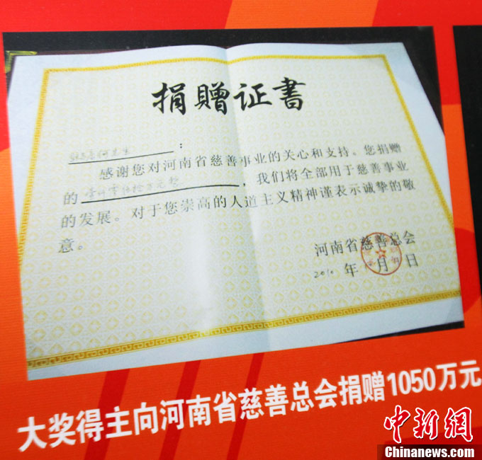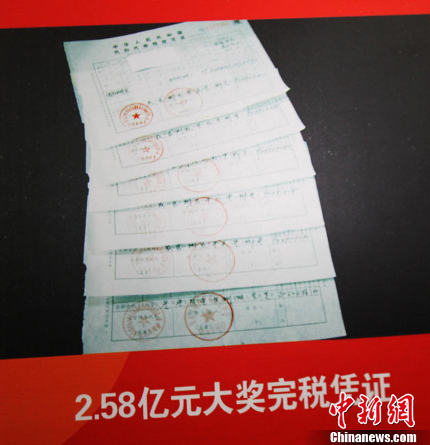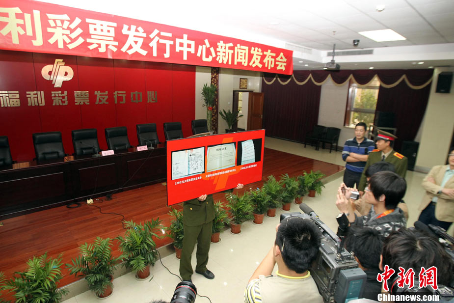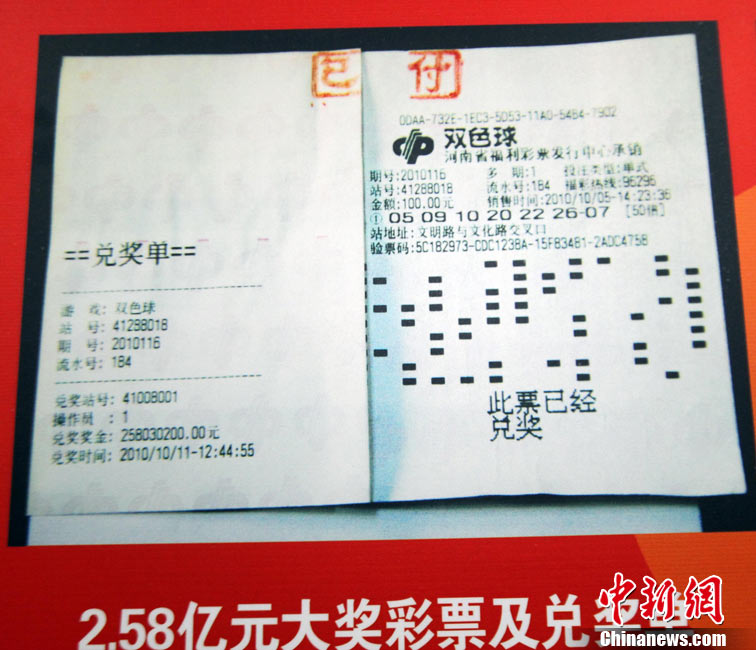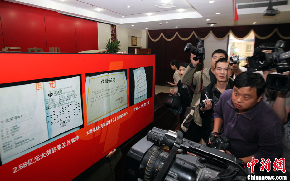 10月13日,河南福彩中心召開(kāi)新聞發(fā)布會(huì)通報(bào)雙色球2.58億兌獎(jiǎng)情況,2.58億巨獎(jiǎng)彩票在發(fā)布會(huì)上曝光。巨獎(jiǎng)于本周一被兌取,得主是一位長(zhǎng)期從事教育職業(yè)的駐馬店本地人,他的大獎(jiǎng)為機(jī)選1注后50倍投,他將捐款1050萬(wàn),為目前中國(guó)彩市大獎(jiǎng)得主單筆最高捐款。2.58億是繼2009年安陽(yáng)彩民獲3.59億后,河南彩民攬獲的又一個(gè)超級(jí)巨獎(jiǎng)。中新社記者 王中舉 攝