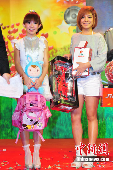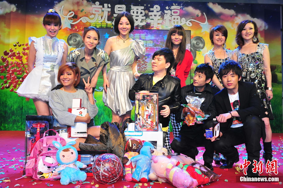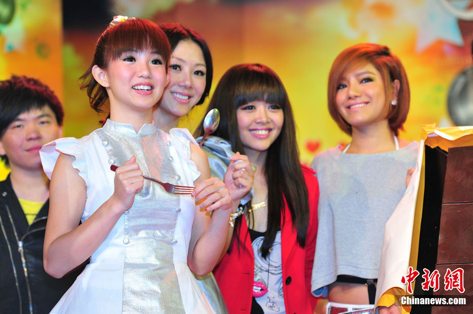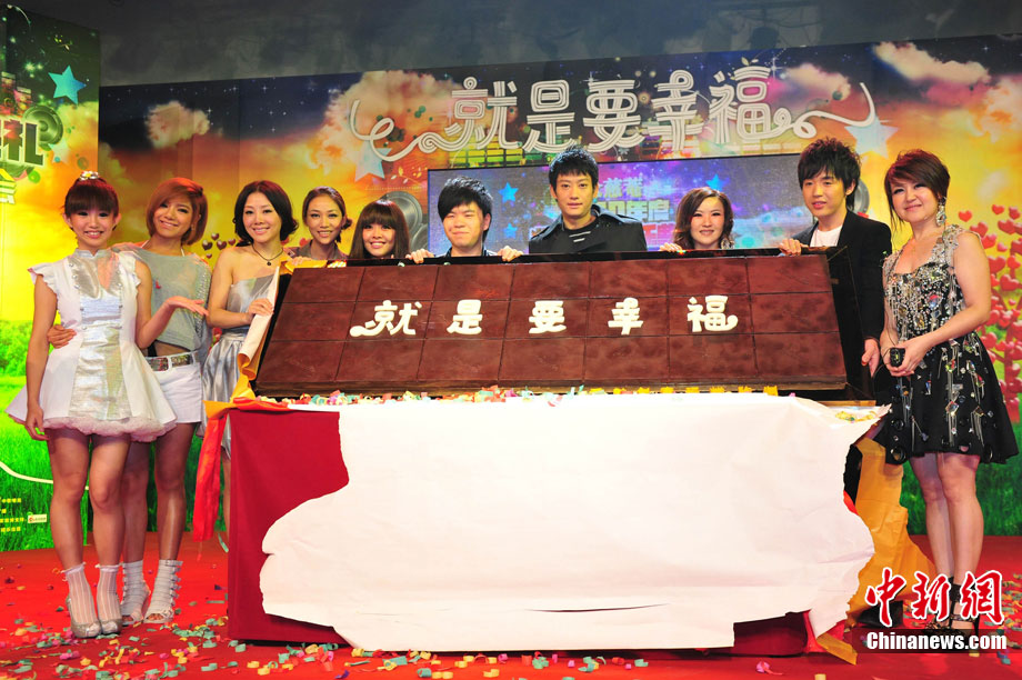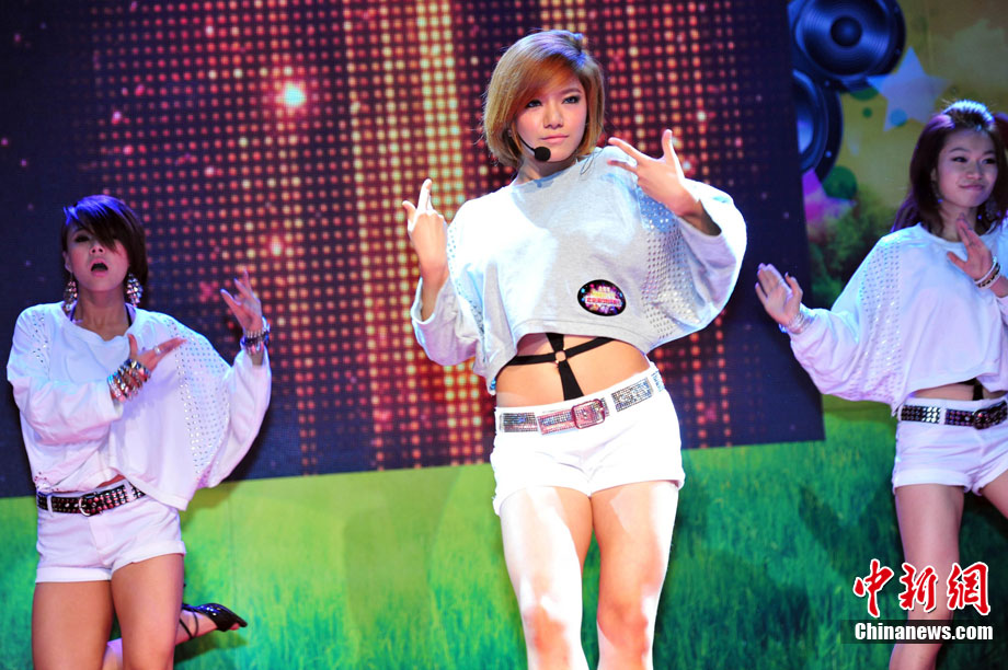 10月17日,2010年度北京流行音樂典禮歡唱會啟動儀式在京舉行,宣告“中歌榜”年度盤點正式啟動。江映蓉、臺灣“奶油甜心”郭書瑤、王箏、黃琦雯、常石磊等樂壇的新生力量到場助陣,共同品嘗一塊重達8公斤的巨型巧克力,巧克力上的“就是要幸福”字樣也是本年度典禮口號。圖為江映蓉在現(xiàn)場勁歌熱舞。中新社記者 李學仕 攝