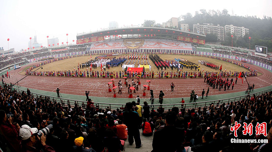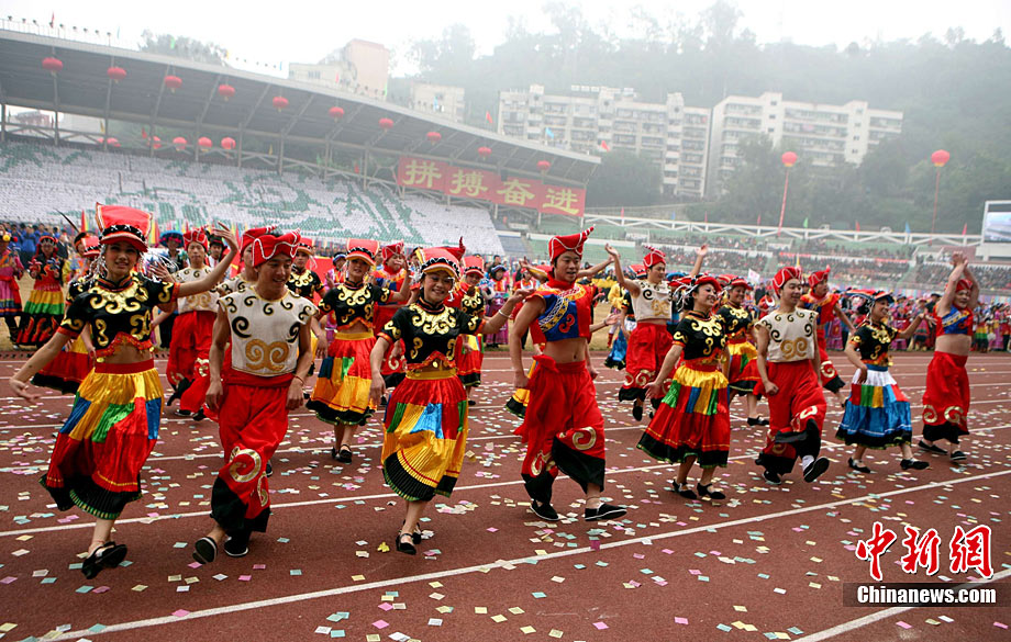 11月10日,四川省第13屆少數(shù)民族體育運動會在攀枝花拉開帷幕。來自涼山州、甘孜州、阿壩州、樂山市、雅安市等10個市州以及西南民族大學、成都體育學院共12支代表隊1066名運動員,將參加陀螺、民族式摔跤、田徑等9個競賽項目7天的比賽。本次運動會是四川歷屆少數(shù)民族運動會規(guī)模最大的一次,所有項目均可免費觀看。中新社發(fā) 劉忠俊 攝