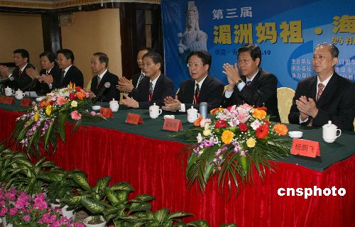 第三屆湄洲媽祖·海峽論壇10月30日在媽祖故鄉(xiāng)福建莆田開幕。全國政協(xié)副主席張克輝發(fā)來賀信,中國僑聯(lián)主席林兆樞出席開幕式。來自中國、菲律賓、日本、澳大利亞、新西蘭、馬來西亞、印尼、新加坡、巴拉圭、南非、荷蘭、臺(tái)灣、香港等13個(gè)國家和地區(qū)的一百多名僑領(lǐng)以及媽祖文化專家、學(xué)者,將圍繞“媽祖文化與華人華僑”主題進(jìn)行為期兩天的研討交流。出席開幕式的還有福建省政協(xié)副主席、統(tǒng)戰(zhàn)部長張燮飛等。中新社發(fā) 張勤 攝