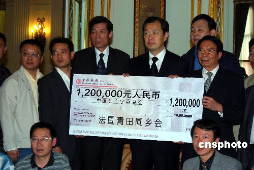 法國青田同鄉(xiāng)會十九日通過中國駐法大使館,向四川地震災區(qū)捐款,支持抗震救災。至今,旅法僑胞向四川地震災區(qū)捐款已超過一千萬元人民幣。中新社發(fā) 吳衛(wèi)中 攝