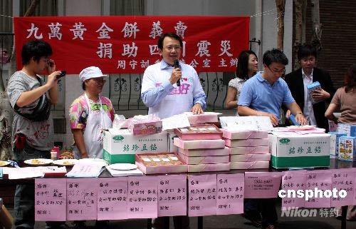 五月二十三日上午,國(guó)民黨“立委”周守訓(xùn)(左三)與“牛媽媽公益之家”合辦(左二為牛媽媽),在臺(tái)灣“立法機(jī)關(guān)”內(nèi)義賣(mài)黃金餅,收入將全部捐給臺(tái)灣紅十字會(huì),作為四川震災(zāi)后的重建基金,該活動(dòng)得到不少“立委”和工作人員的支持。中新社發(fā) 陳立宇 攝