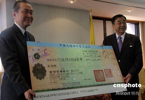 臺(tái)灣創(chuàng)價(jià)學(xué)會(huì)理事長(zhǎng)林釗(左)五月二十三日在此間為四川震災(zāi)捐款新臺(tái)幣一百萬(wàn)元。圖右為臺(tái)灣內(nèi)政部門(mén)負(fù)責(zé)人廖了以。汶川地震發(fā)生十余日,臺(tái)灣佛教團(tuán)體、企業(yè)界持續(xù)行動(dòng),并以“協(xié)助災(zāi)區(qū)安置及重建、教育的恢復(fù)工作”為目標(biāo)。中新社發(fā) 劉舒凌 攝