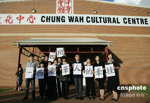 當(dāng)?shù)貢r(shí)間5月25日下午四時(shí),西澳大利亞華人聚集在中華文化中心,舉辦“祈福零八,平安中國(guó)”活動(dòng)為四川地震募集善款。其中,來自河南同鄉(xiāng)會(huì)的華僑打出了“四川——西澳華人的牽掛”的標(biāo)語。中新社發(fā) 高周丹 攝