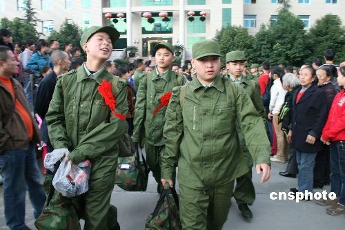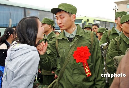 11月23日,四川眉山市首批奔赴西藏服役的新兵,告別家鄉(xiāng)踏上保衛(wèi)祖國的征程。在今年的冬季征兵中,作為地震災(zāi)區(qū)的眉山市廣大適齡青年,被來到當(dāng)?shù)貐⒓涌拐鹁葹?zāi)的英勇的部隊(duì)官兵所感動,紛紛報名應(yīng)征入伍,其中還有不少災(zāi)區(qū)青年和在災(zāi)區(qū)做志愿者的青年踴躍報名。中新社發(fā) 堯遙 攝