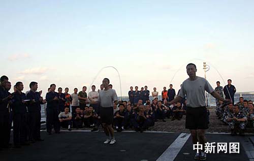 中新網(wǎng)“海口”艦1月10日電 當?shù)貢r間1月10日下午,正在亞丁灣海域執(zhí)行護航任務的“?凇碧枌楎屩鹋灷^續(xù)舉行甲板運動會,參賽官兵參加跳繩項目比賽。