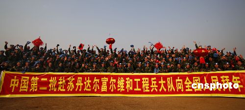 新春佳節(jié)到來之際,正在蘇丹達(dá)爾富爾執(zhí)行維和任務(wù)的濟南軍區(qū)某裝甲師官兵向全國人民拜年。中新社發(fā) 畢華明 攝