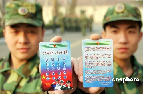3月9日,部隊官兵正在展示革命軍人核心價值觀“銘記卡”。為加深官兵對當代革命軍人核心價值觀的理解掌握,濟南軍區(qū)某部為每名官兵制作了一張小巧精美的當代革命軍人核心價值觀“銘記卡”,正面是五個方面的基本內(nèi)容,背面是簡要的基本內(nèi)涵,官兵們可以隨時從衣兜里取出背記。中新社發(fā) 梁志杰 攝