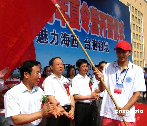 7月3日,海峽西岸2008年臺(tái)胞青年夏令營(yíng)在福州開營(yíng),福建省委常委、宣傳部長(zhǎng)唐國忠(左一)為夏令營(yíng)授旗。作為全國臺(tái)聯(lián)臺(tái)胞青年千人夏令營(yíng)的福建分營(yíng),本次夏令營(yíng)為期6天,吸引110多名臺(tái)胞青年參加。中新社發(fā) 林維莉 攝