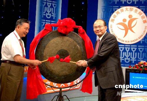 7月21日,福建省科學(xué)技術(shù)協(xié)會主席、中科院院士吳新濤(左)與臺灣中華青年交流協(xié)會理事長張昌吉為第七屆海峽兩岸大學(xué)生辯論賽開賽鳴鑼。當(dāng)日,第七屆海峽兩岸大學(xué)生辯論賽在福州開賽,來自海峽兩岸共十六支高校代表隊(duì)參加角逐。中新社發(fā) 劉可耕 攝