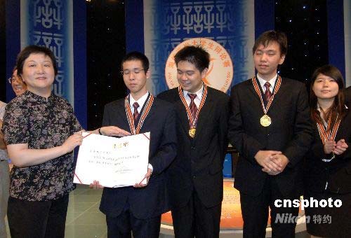 7月23日,中國(guó)科學(xué)技術(shù)協(xié)會(huì)書記處書記程?hào)|紅女士為榮獲第七屆海峽兩岸大學(xué)生辯論賽團(tuán)體冠軍的來自臺(tái)灣的東吳大學(xué)代表隊(duì)頒獎(jiǎng)。當(dāng)日,歷時(shí)3天的第七屆海峽兩岸大學(xué)生辯論賽在福州圓滿落幕。中新社發(fā) 劉可耕 攝
