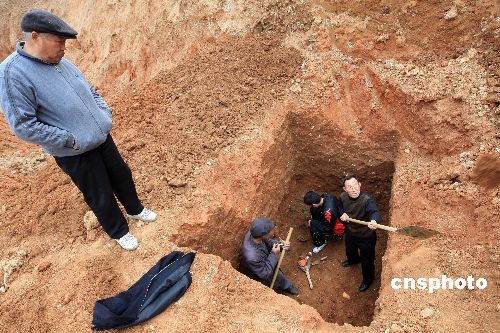 3月11日,安徽淮北市淮北商場建筑工地,考古人員正在對古漢墓進行發(fā)掘。據(jù)考古人員介紹,截至目前,已發(fā)現(xiàn)兩漢時期的磚室和土坑墓葬30座,清理出古墓葬6座,出土漢代玉器、青銅器和陶器50余件,這些出土文物對研究漢代的墓葬風(fēng)俗提供了實物依據(jù)。中新社發(fā) 謝正義 攝