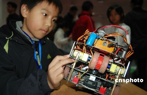 2009年3月29日,2009年“VEX”杯蘇州市青少年機(jī)器人比賽在蘇州善耕實(shí)驗(yàn)小學(xué)開幕,來自蘇州敬文實(shí)驗(yàn)小學(xué)及其周邊縣市的77所中小學(xué)校的467位選手參賽,參賽者分別進(jìn)行了機(jī)器人“踢足球”、“滅火”和“基本技能”等八個(gè)項(xiàng)目的角逐,場面十分熱鬧。中新社發(fā) 蘇民 攝