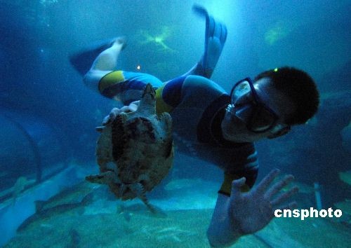 4月13日,福州一漁民將其幾天前在海邊偶然發(fā)現(xiàn)的“玳!焙}斔瓦M(jìn)福州左海海底世界。這只“玳瑁”長(zhǎng)約12厘米,重約1750克,嘴如鷹嘴,甲殼為褐色,頜緣鋸齒狀。據(jù)飼養(yǎng)員介紹,這只小海龜大約才2歲,還屬于“嬰兒”狀態(tài)!扮殍!庇址Q(chēng)十三鱗,屬于國(guó)家二級(jí)保護(hù)動(dòng)物,一般壽命可達(dá)1500歲,成年的玳瑁(約20多歲)身長(zhǎng)1米,體重40~60公斤,主要生長(zhǎng)于熱帶及亞熱帶地區(qū)的暖水性海洋。該類(lèi)海龜在中國(guó)主要分布于臺(tái)灣、福建和海南等沿海一帶海域。 中新社發(fā) 穆長(zhǎng)梓 攝
