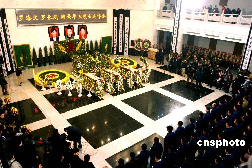 為保護湖南電網(wǎng)而犧牲的湖南電力公司羅海文、羅長明、周景華三烈士追掉會,1月30日在長沙陽明山殯儀館舉行,上千群眾前往悼念。湖南省委常委、長沙市委書記陳潤兒,省人大常委會副主任陳叔紅,省人民政府副省長陳肇雄,省政協(xié)副主席陽寶華,省軍區(qū)副政委萬建華等省領(lǐng)導前往悼念。圖為湖南各界沉痛悼念抗冰保電的三位烈士。中新社發(fā) 殷中民 攝