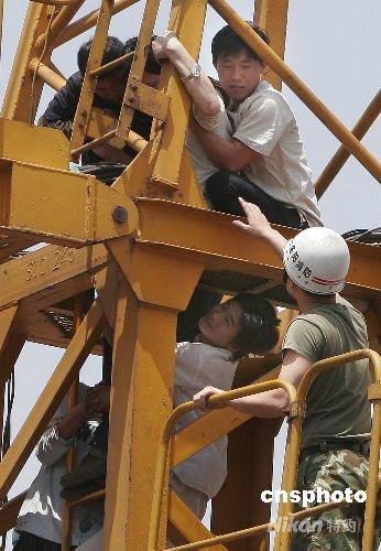 一名男青年因?qū)Ω赣H在建筑工地猝死賠償不滿而爬上30多米高的塔吊頂端,身懸空中,意欲輕生。生死攸關(guān)之時,消防官兵經(jīng)過兩個多小時的巧妙周旋和艱難營救,男青年被安全救回地面。 中新社發(fā) 張曉理 攝