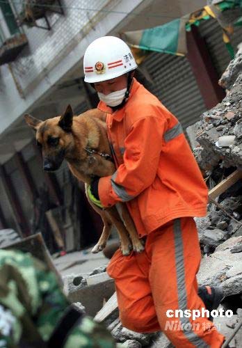 組圖:消防搜救隊(duì)員抱搜救犬進(jìn)救災(zāi)現(xiàn)場(2)