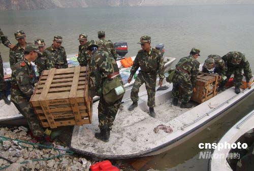 解放軍和武警官兵在搬運沖鋒舟上的救災(zāi)物資。中新社發(fā) 郭國權(quán) 攝