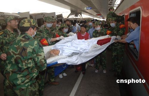 組圖:地震災(zāi)區(qū)首趟運送傷員專列順利抵達(dá)重慶(4)