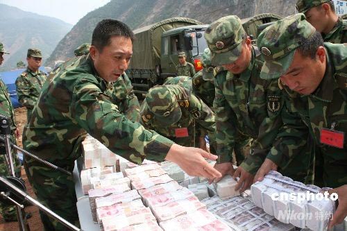 5月22日,第二炮兵某技術(shù)總隊政委高海華將620多萬元人民幣金庫庫款、重要資料等清單移交給了綿陽市農(nóng)村信用聯(lián)社負責(zé)人陳利雄。四川省北川縣信用聯(lián)社八層大樓,是北川縣損壞最嚴(yán)重的建筑之一,里面不但埋有多名工作人員,而且還有存放大量資金的國家金庫。5月15日上午,第二炮兵某技術(shù)總隊接到任務(wù)后,立即組織了由86名專業(yè)技術(shù)骨干組成的搜救隊,攜帶挖掘機、切割機、生命探測儀等設(shè)備火速趕往該聯(lián)社進行被埋人員和金庫庫款的搶救。共營救出9名幸存者,并于21日晚成功搶救出金庫庫款620多萬元和大量寶貴資料。圖為救援人員認真清點現(xiàn)金。中新社發(fā) 陳雙維 攝