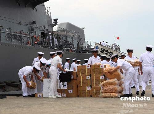 日本艦艇“漣”號訪華,隨艦搭載向四川災(zāi)區(qū)提供的救援物資。中新社發(fā) 宋吉河 攝
