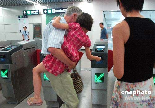 圖為在機場線三元橋車站入口處,外國游客一家人正在投票進站。中新社發(fā) 張雙雙 攝
