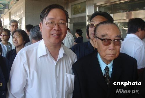 圖為90多歲高齡的中國前首任駐美大使柴澤民(右)和周恩來總理秘書羅青長之子(左)出席告別儀式。中新社發(fā) 韓凱 攝