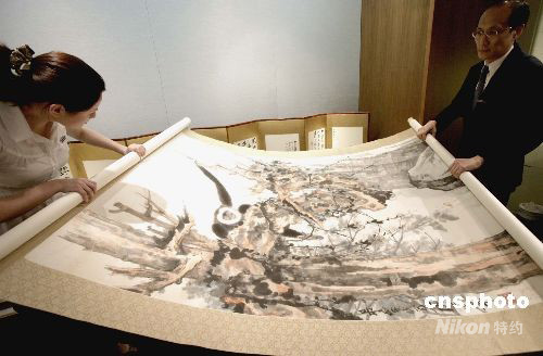 香港蘇富比2008秋季中國書畫拍賣會將于十月六日在香港會展中心舉行,其中吳冠中、張大千作品成為焦點。圖為九月九日舉行的傳媒預(yù)展會上介紹張大千一百一十歲誕辰紀(jì)念專輯之作,于一九五九年的《老樹騰猿》。中新社發(fā) 張勤 攝