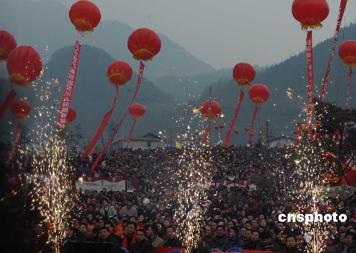 12月31日,四川大地震極重災區(qū)的北川縣上萬民眾干部團聚擂鼓鎮(zhèn),燃放簡單的焰火迎元旦,告別難忘的2008年。中新社發(fā) 賈國榮 攝
