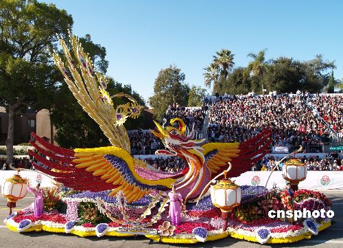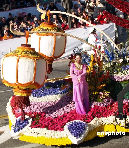 臺(tái)灣中華航空公司的玫瑰花車“火鳳凰”在美國(guó)洛杉磯第120屆玫瑰花車游行勇奪大獎(jiǎng)。該主題花車名為“臺(tái)灣燈會(huì)”,花車以中國(guó)燈籠和“仙女下凡”為元素,奪人眼球。中新社發(fā) 盧威 攝