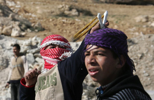 1月5日,在約旦河西岸城市希伯倫附近,巴勒斯坦少年向以色列士兵投擲石塊。當天,一些巴勒斯坦人在這里抗議以軍對加沙的軍事行動,并與以色列士兵發(fā)生沖突。