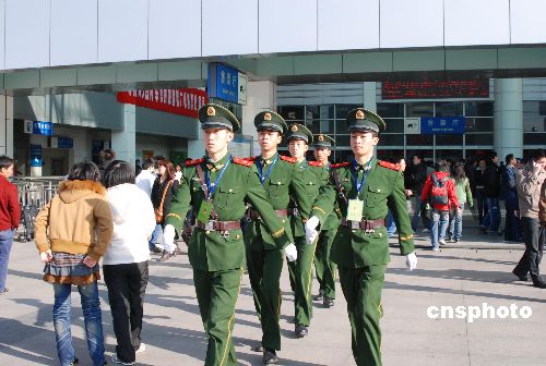一月九日,武警福建總隊(duì)直屬支隊(duì)派出五十名官兵進(jìn)駐福州火車站,進(jìn)行為期四十天的“春運(yùn)”執(zhí)勤。中新社發(fā) 曾朝群 攝