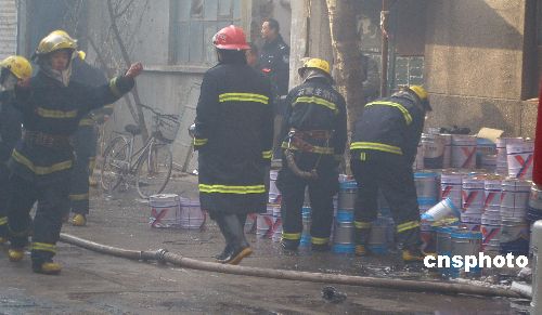 圖為火勢得到控制后消防人員在濃煙中將一樓倉庫中的大量油漆轉(zhuǎn)移出來。中新社發(fā) 高新國 攝