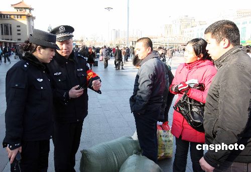 1月11日,2009年春運(yùn)正式開始,北京警方啟動(dòng)“服務(wù)旅客、平安春運(yùn)”活動(dòng),為旅客發(fā)放安全提示卡,張貼海報(bào)介紹購(gòu)票、乘車等出行注意事項(xiàng),確保市民度過(guò)一個(gè)安全、快樂(lè)的春節(jié)。中新社發(fā) 任海霞 攝