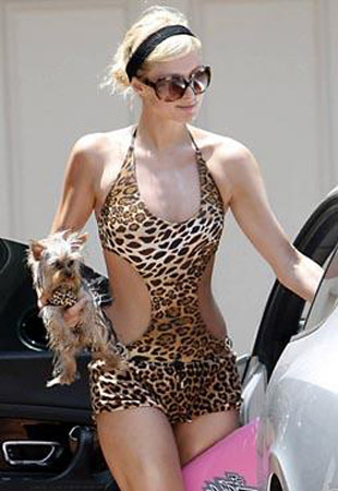 愛(ài)出風(fēng)頭的帕麗斯·希爾頓不僅要把自己打扮得漂漂亮亮,就連她的寵物狗也不放過(guò)。帕麗斯外出時(shí)穿上一套性感的豹紋裝,并給她的寵物狗也穿上了一件同款豹紋裝,上面還帶有一條黑色的蕾絲裙邊,十分搶眼。