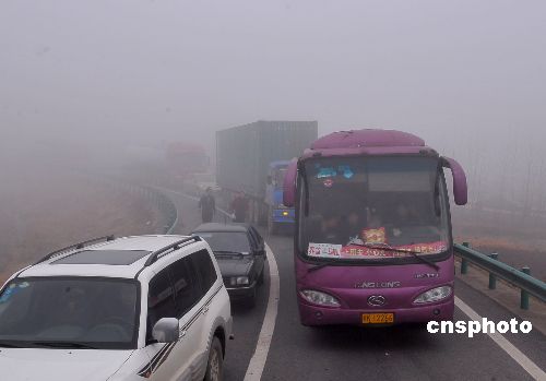 1月22日,受北方南下冷空氣與當?shù)嘏瘽駳饬鹘粎R影響,當天清晨5時左右起,安徽滁州遭受大霧襲擊,境內寧洛、滬陜、京臺高速能見度在50至100米,嚴重影響春運期間的交通安全。大霧期間,滁州高速交警對轄區(qū)所有高速入口全部實行暫時封閉,在增派干警加大路面巡邏力度的同時,還安排警車引導車輛行駛。截至上午10時左右,濃霧逐漸散去,所有高速道口實行了間段放行。中新社發(fā) 王家國 攝
