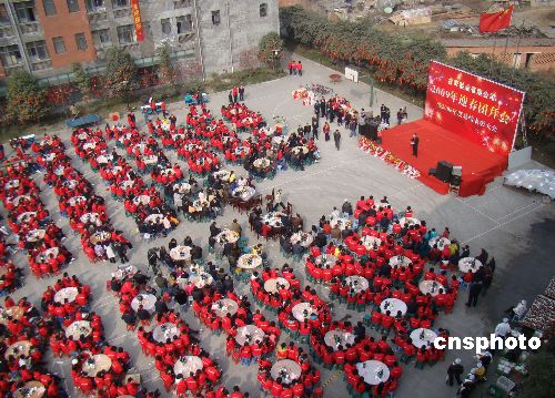 1月22日,四川災(zāi)區(qū)一家名為古奇鞋業(yè)的企業(yè)在廣場上辦起了規(guī)模宏大的“壩壩宴”。該企業(yè)董事長現(xiàn)場承諾:“不管企業(yè)如何困難,都會(huì)及時(shí)發(fā)放員工工資,不會(huì)因任何原因裁員!”將團(tuán)年飯的氣氛推向高潮。圖為該企業(yè)團(tuán)年飯現(xiàn)場。中新社發(fā) 王萌 攝