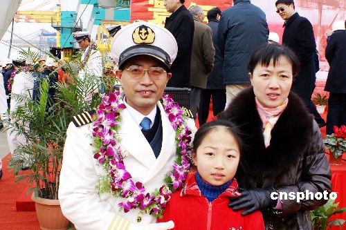 “振華4號”的輪機(jī)長和妻女在碼頭相遇,她們母女倆特地從老家連云港趕來迎接。中新社發(fā) 李根 攝