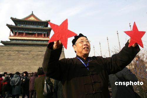 北平和平解放的見證者手持紅星重溫當(dāng)年歷史時(shí)刻。中新社發(fā) 富田 攝