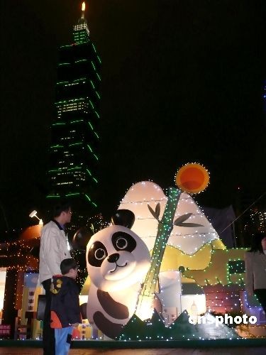 2月5日,元宵節(jié)將至,2009臺(tái)北燈節(jié)各式花燈正式登場。隨著大陸贈(zèng)臺(tái)大熊貓團(tuán)團(tuán)圓圓正式與臺(tái)灣民眾見面,今年花燈新增的大熊貓?jiān)煨突舫蔀橐淮罅咙c(diǎn),受到民眾的喜愛。中新社發(fā) 路梅 攝