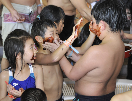 2月8日,游客們?cè)谌毡旧衲未ǹh享受奇特的“巧克力浴”。