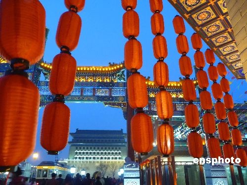 2009年2月8日,農(nóng)歷正月十四,千余盞大紅燈籠及中國結將北京前門大街妝扮出濃郁的節(jié)日氣氛。中新社發(fā) 玉龍 攝