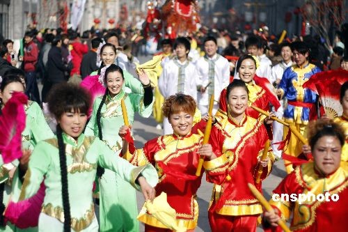 2月9日上午,來自北京、河北、山東等3個省市的12支花會隊,在前門大街舉行“傳統(tǒng)民間花會踩街”活動,喜迎正月十五元宵節(jié)的到來。踩街是一種中國傳統(tǒng)民間民俗藝術(shù)表演形式,類似國外的花車游行,表演隊伍邊行進邊表演,游客沿途觀看。花會隊從正陽門箭樓南側(cè)和前門五牌樓出發(fā),16只南獅和北獅為大隊人馬開道,隨后中幡、旱船、二魁摔跤、地秧歌、鼓子秧歌等將依次向珠市口行進。