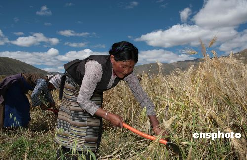 西藏高原上的金色收獲。中新社發(fā) 扎西朗杰 攝