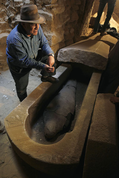 2月11日,在位于塞加拉地區(qū)著名的階梯金字塔西南的墓地中,埃及最高文物委員會主席扎希·哈瓦斯打開了一具新發(fā)現(xiàn)的古埃及石棺,并從中找到一具保存完好的木乃伊。