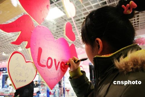 2月11日,情人節(jié)將至,河南省安陽市某大型商場在顯著位置設(shè)置了一面“情人節(jié)許愿墻”,供顧客留下浪漫心愿和愛情宣言。中新社發(fā) 李中華 攝