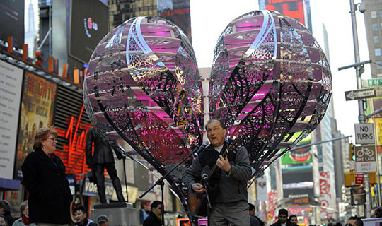 一位男子在美國紐約時報廣場的心型雕塑前為他的妻子唱歌表達愛意。
