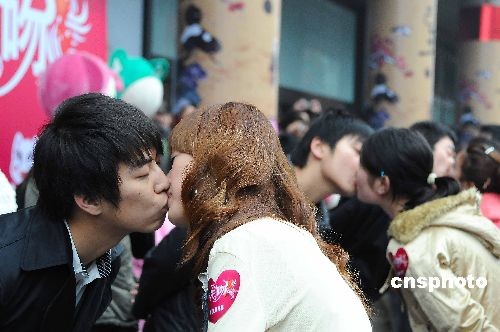 2月14日,杭州市首屆情人節(jié)“牛吻”大賽在武林銀泰、西湖銀泰、杭州百貨大樓三地同時(shí)舉行,活動(dòng)吸引了80對(duì)情侶前來參加。中新社發(fā) 引煒 攝