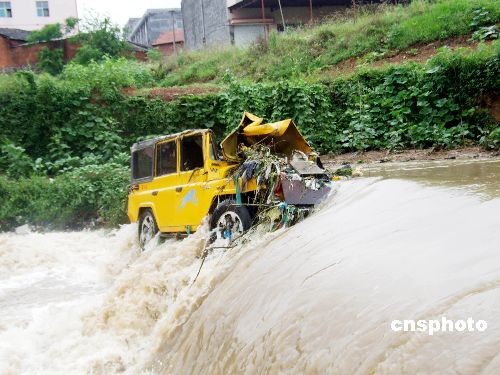 08年6月11日,一輛載人吉普車在通過(guò)浙江浦江縣七里村一座小橋時(shí)為避讓對(duì)面行人,不幸連車帶人墜入水中。吉普車隨著水流輾轉(zhuǎn)“漂流”1000多米,最終擱淺在溪中下游一座攔水壩處。一位青年正好路過(guò),看到有車子落水,他急忙趕了過(guò)去,當(dāng)他看到司機(jī)托起坐在副駕駛室里一名女子時(shí),立即將該女子拉了上來(lái)。一會(huì),司機(jī)也從車?yán)镢@了出來(lái),因水勢(shì)兇猛,吉普車一路翻轉(zhuǎn),順著溪流沖向下游,他們只能眼睜睜地看著吉普車隨水飄走。中新社發(fā) 許康平 攝