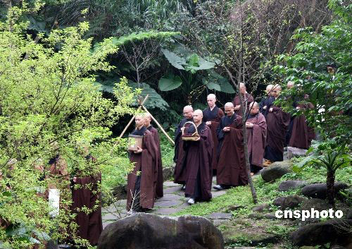2月15日,臺灣法鼓山創(chuàng)辦人圣嚴(yán)法師追思法會暨植存在法鼓山舉行。參加追思法會暨植存的臺灣地區(qū)領(lǐng)導(dǎo)人馬英九、蕭萬長隨眾僧和信眾送圣嚴(yán)法師舍利函前往植存區(qū)。中新社發(fā) 陳立宇 攝